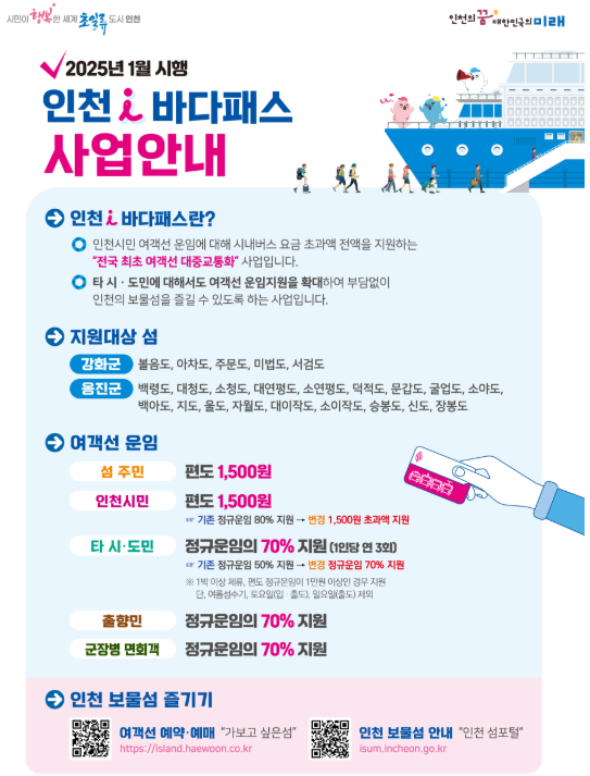 인천시가 전국 최초로 **시내버스 요금 수준으로 여객선을 이용할 수 있는 ‘인천 i 바다패스’**를 도입했습니다!
