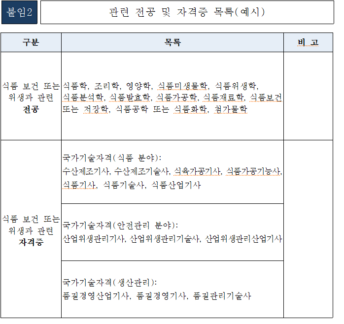 - 식품 및 품질관리 관련 전공, 자격증, 경력 보유자 (붙임2 참고)