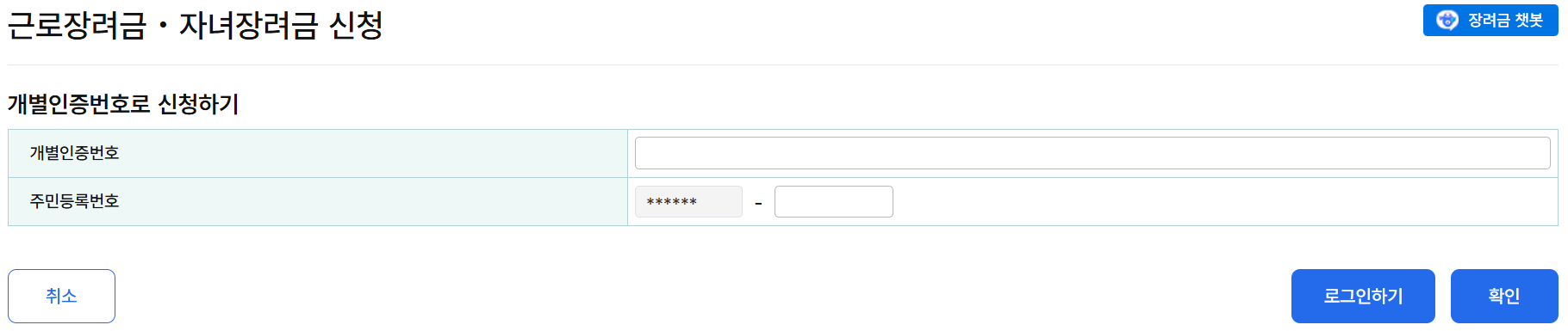 - 메뉴 이동: 조회/발급 > 근로·자녀장려금 신청