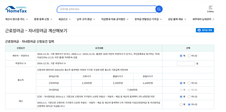- 메뉴 이동: 근로·자녀장려금 신청 메뉴